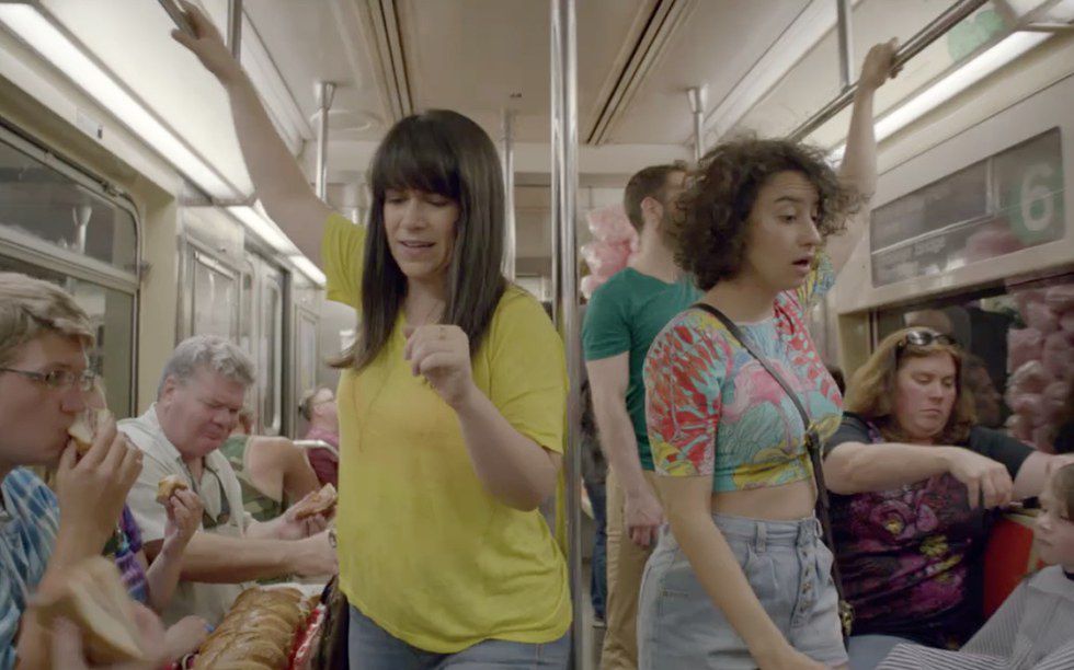 Example: Abbi and Ilana catch the last subway cart and attempts to make their way to the front of the train, and they see every type of people you see in New York. You’ve got your tourists, the creeps, the couple that won't stop making out, the talented dancers, the moms with their babies and strollers, and so on.