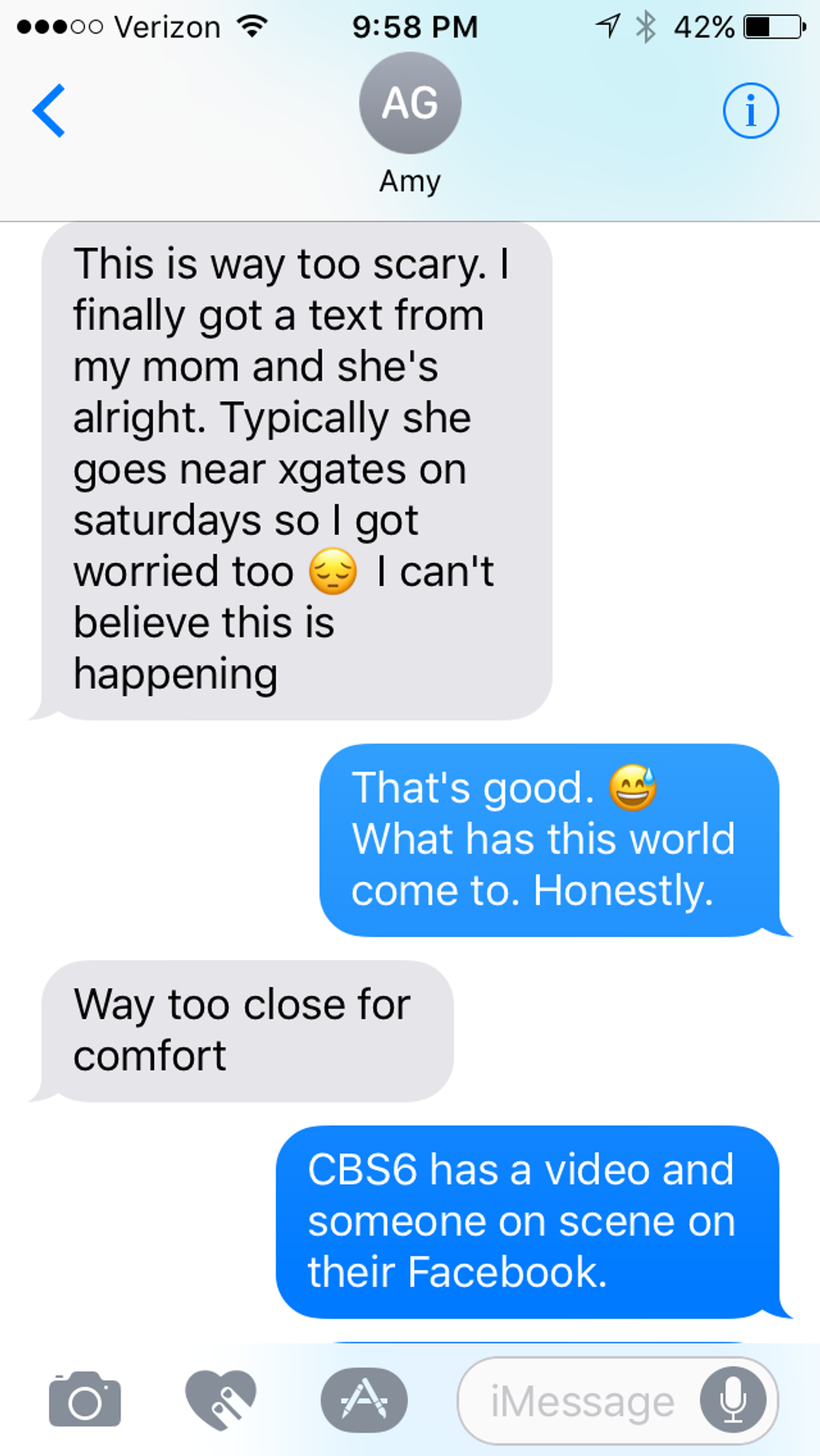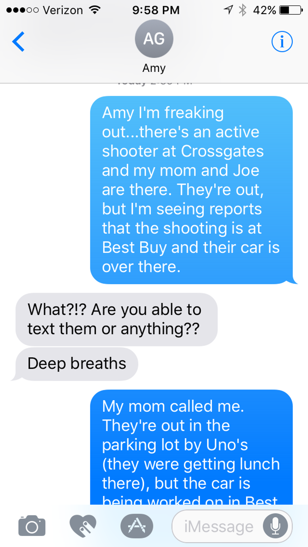 I knew I wasn’t the only one freaking out about this. Plenty of my friends work in Crossgates. I felt relief at knowing that they were all safe and that they had even taken responsibility for the people in their stores and made sure they were safe as well. There were also other people freaking out for the people who were there. Amy was terrified that her mom had also gone to the mall, as she usually went there on Saturdays. Thankfully, she didn’t go.