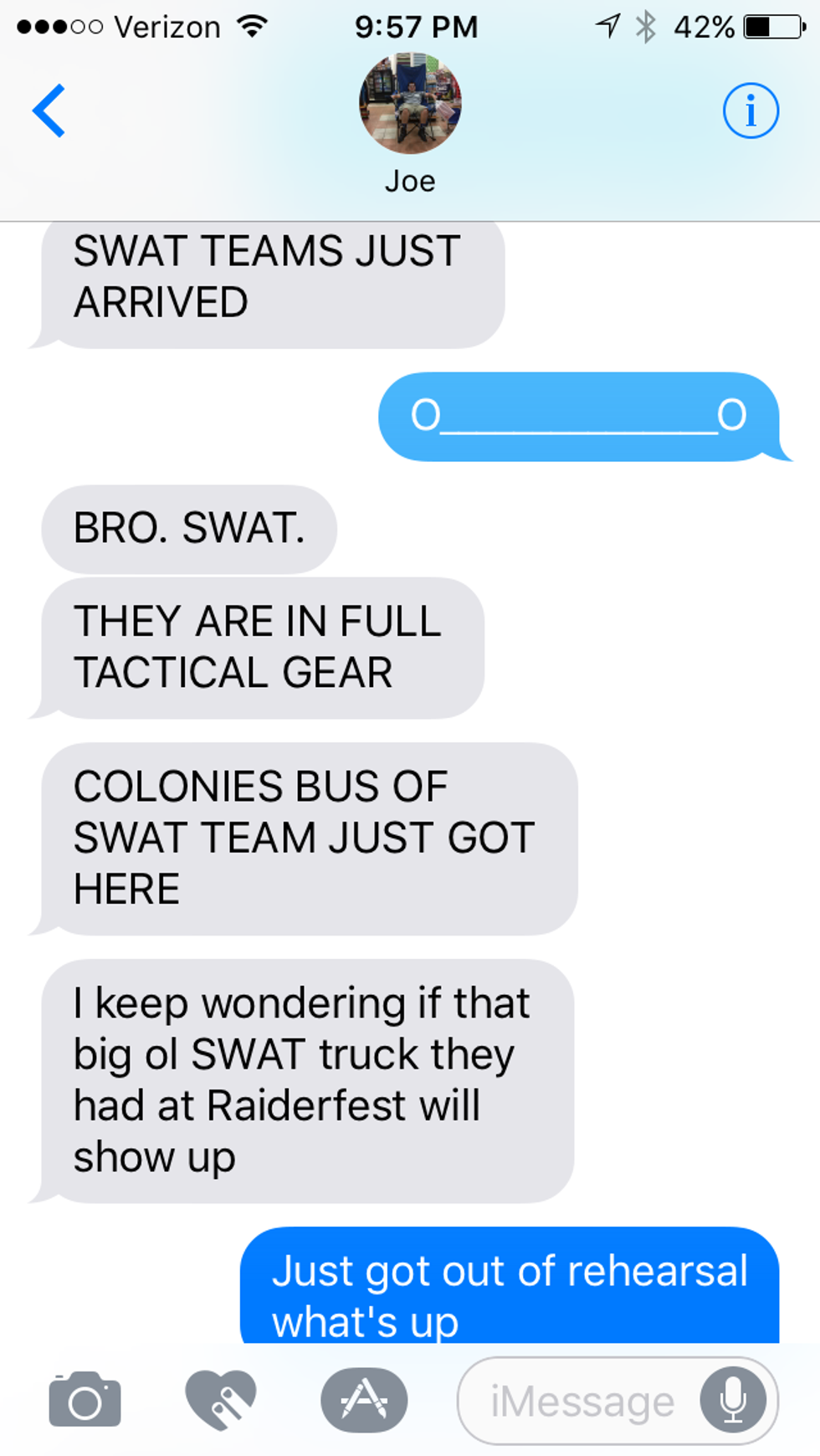 Things continued to escalate. As if it weren’t enough to have police armed with assault rifles in the mall, SWAT teams arrived on buses. That was when I knew things were really serious.