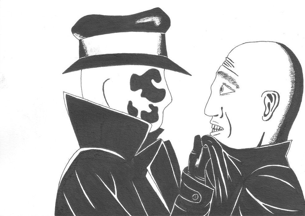 Somehow in the "Watchmen" Rorschach became a hero, one of the first main heroes, not sidekick or “partner,” to lose in such an ultimate way. Not killed by the villain, but killed by his friends and dying without a single person to mourn the loss of this hero, not even his friends. Though in the end of the comic it seems that his “friends” mourn his loss, but I see a different perspective, to me it seemed they mourn not the loss of a close friend but a loss of ideals.