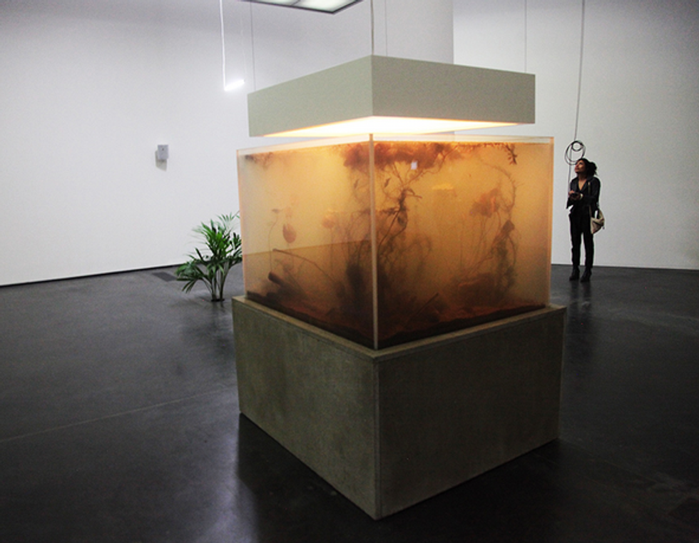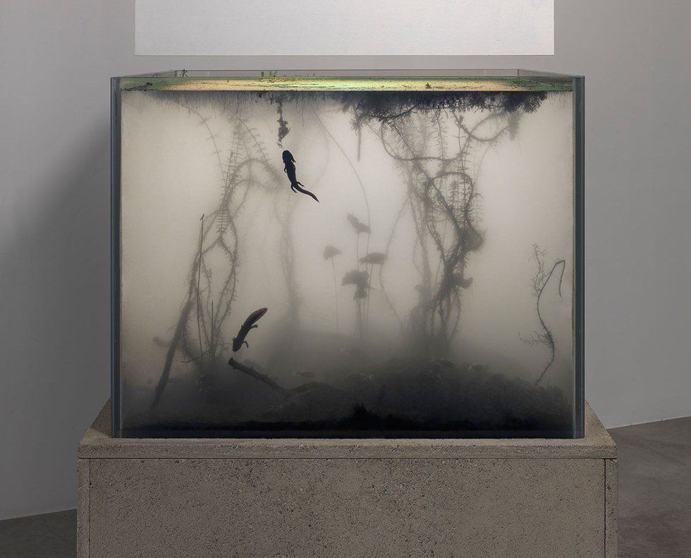 In one of his most recent pieces entitled “Nympheas Transplant (14-18)” (2014), he creates aquariums based on Monet’s self-cultivated and bioengineered garden in Giverny. The aquariums contain samples of water lilies and mimic the exact conditions of Monet’s lily pond in Giverny from the years 1914 to 1918. Pierre Huyghe worked closely with botanists to ensure that the lighting, temperature, humidity, and ecosystem were an exact replica of the original pond. This amount of control mimics the control Monet had over cultivating his garden to create compositions for his paintings. The aquariums often fog up which creates an effect similar to the blurring of form in an impressionistic painting. They reference the atmosphere and composition of Monet’s large-scale paintings of the lily pond that he made towards the end of his life such as Les Nuages.