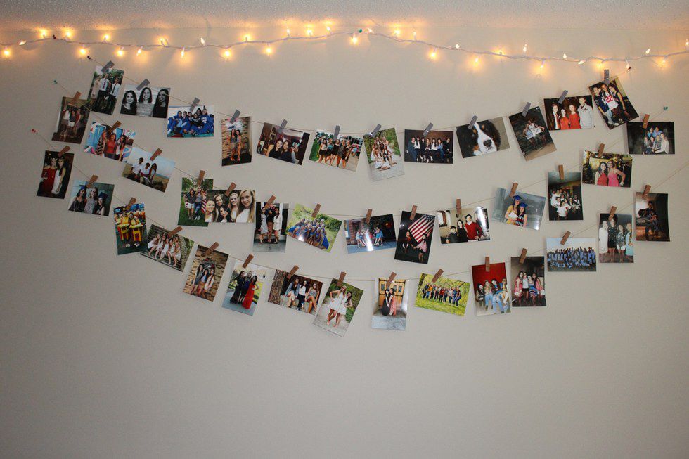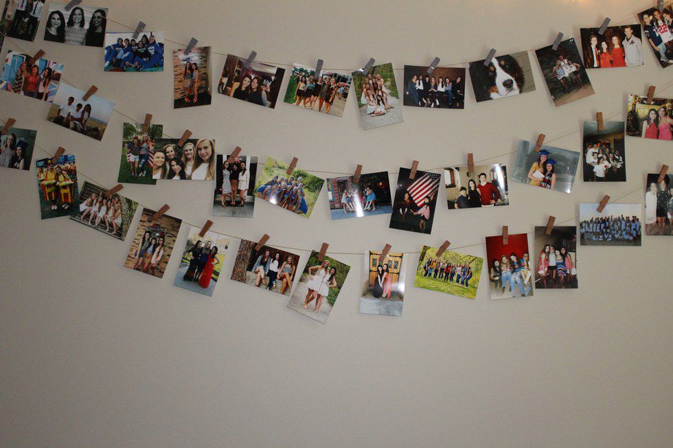 A week or so before college started I went through my pictures and sent a huge chunk of them to Walgreens to print which is about $.10 per picture. I bought string, a pack of thumbtacks and clothes pins and string my string across attaching it to the thumbtacks then added pictures! Another easy way to spice up your dorm.