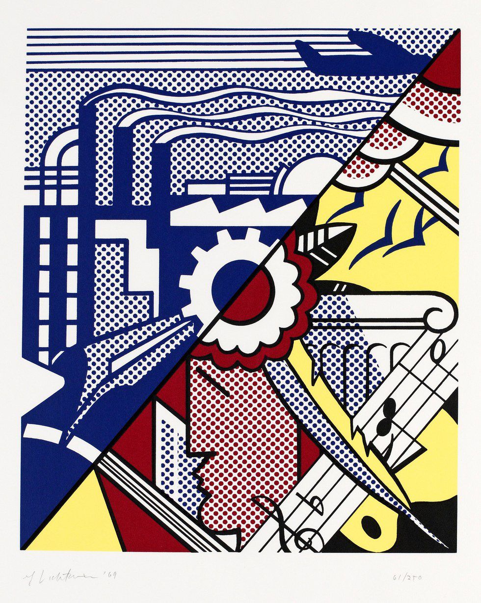 The piece is entitled Industry and the Arts II, made in 1969. It's a Pop Art screen-print, a category of art that Ray Lichtenstein explored in his work. At first I walked by it without a thought as the class toured the Wichita Falls Museum of Art. Loganne called me over, saying she thought I would appreciate the piece, and she was right. The contrast was, of course, the first part of it that caught my eye: the primary colors reflecting the uniform of Superman, the diagonal line drawn straight through, and the designs themselves. The industrial vision of a plane streaming past a factory puffing smoke is offset by a mechanical cog in the center surrounded by polka dots. On the other side, the cog becomes a flower shape. The red and yellow interlace with solid prints mixed with polka dots. A man appears to be whistling, or perhaps he’s a Native American with a feather in his hair. Birds fly above the man’s head with a stream of musical notes diagonally placed across the section. More and more details appeared the longer I looked at the print. Once the visual aspects sunk in, I realized how much of a personal and political significance Lichtenstein had created for a 23-year-old college student in Texas, 2016.