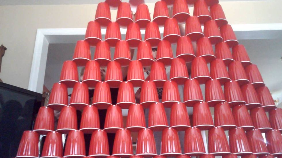Why continue to unload the dishwasher like a normal adult when you could get distracted halfway through and start constructing a mountain of plastic cups.