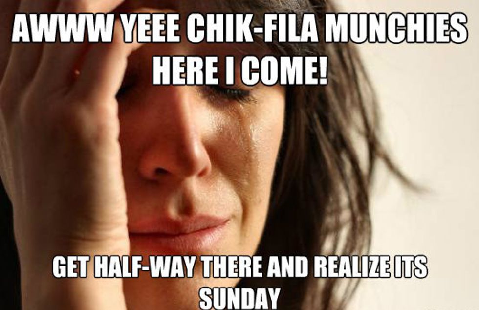 1. Waking up just in time for Chick-fil-A bfast, driving all the way there and only then remembering that today is Sunday