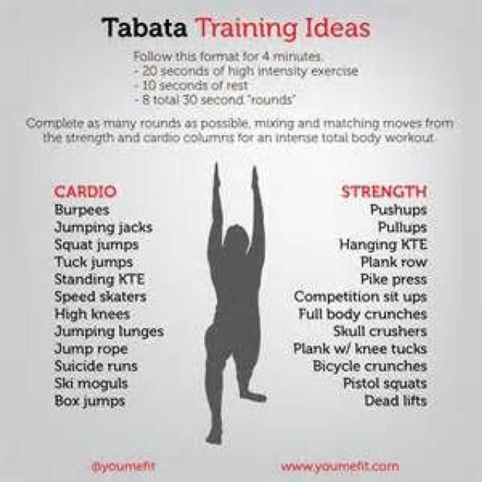 Another good workout is Tabata. This is a high intensity interval training workout. This features exercises that last four minutes.