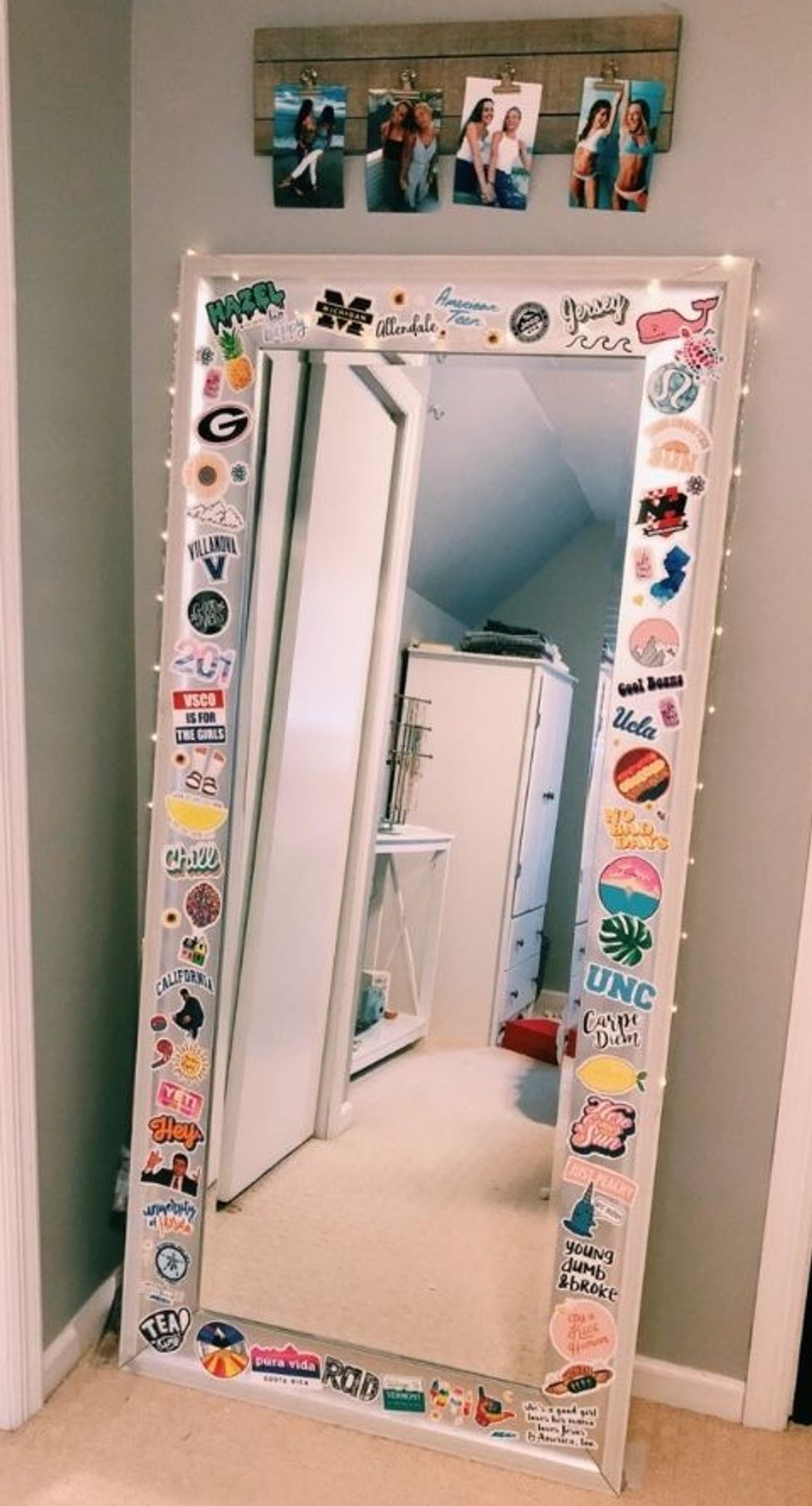 If you want to add a little personality to a mirror, window, or even an old piece of furniture, try stickers! You can buy random sticker packs off of Wish for cheap if you want to cover a large area and don't really care what the stickers are. Or you can buy a couple of stickers off of Redbubble if you only want to cover some stuff.