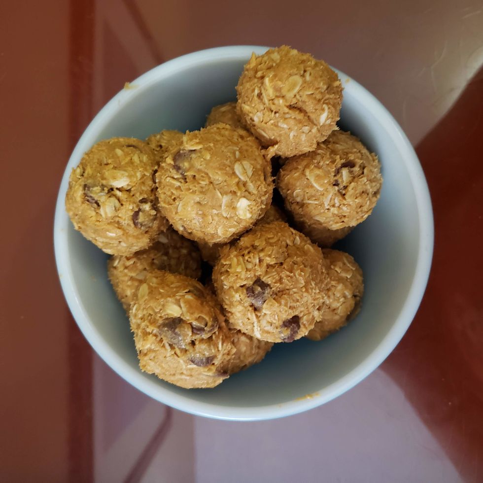 Mix 1 cup rolled oats, 1/2 cup chocolate chips, 1/2 cup peanut butter, and 1/3 cup honey in a bowl. Roll them into balls, then put them in the fridge for a few hours. Yummy snack!