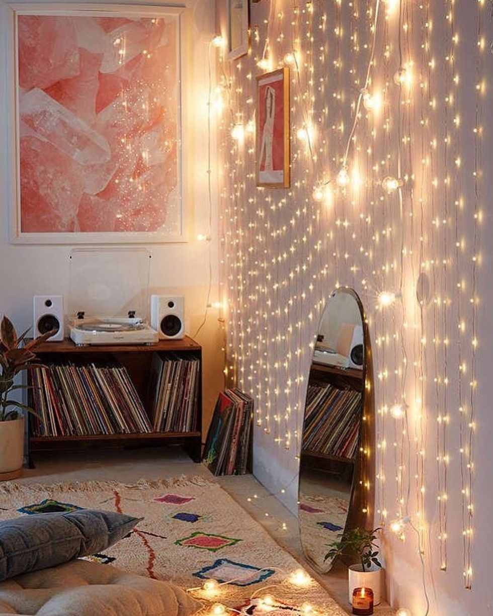 Lights can totally transform your room. I always prefer to have plug in remote operated lights because you do not have to deal with batteries and you can turn them off all from the comfort of your bed. They create such a nice warm comfy ambiance in your room.