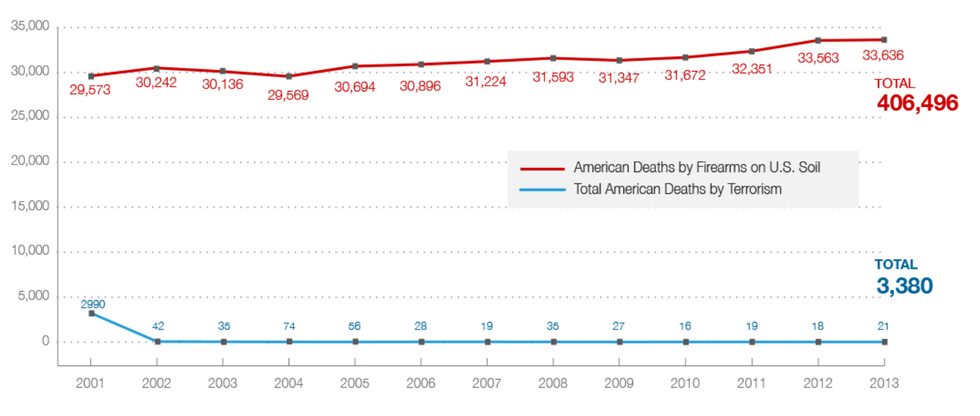 For every one American killed by terrorism, more than a thousand are killed by gun violence. We go into a panic over an average of 31 deaths by terorrism a year (2004-2013), but have become numb to an average of nearly 32,000 deaths by gun a year in the same time period. There are more Americans killed by guns in a single year than Americans killed by terrorism in the past decade.
