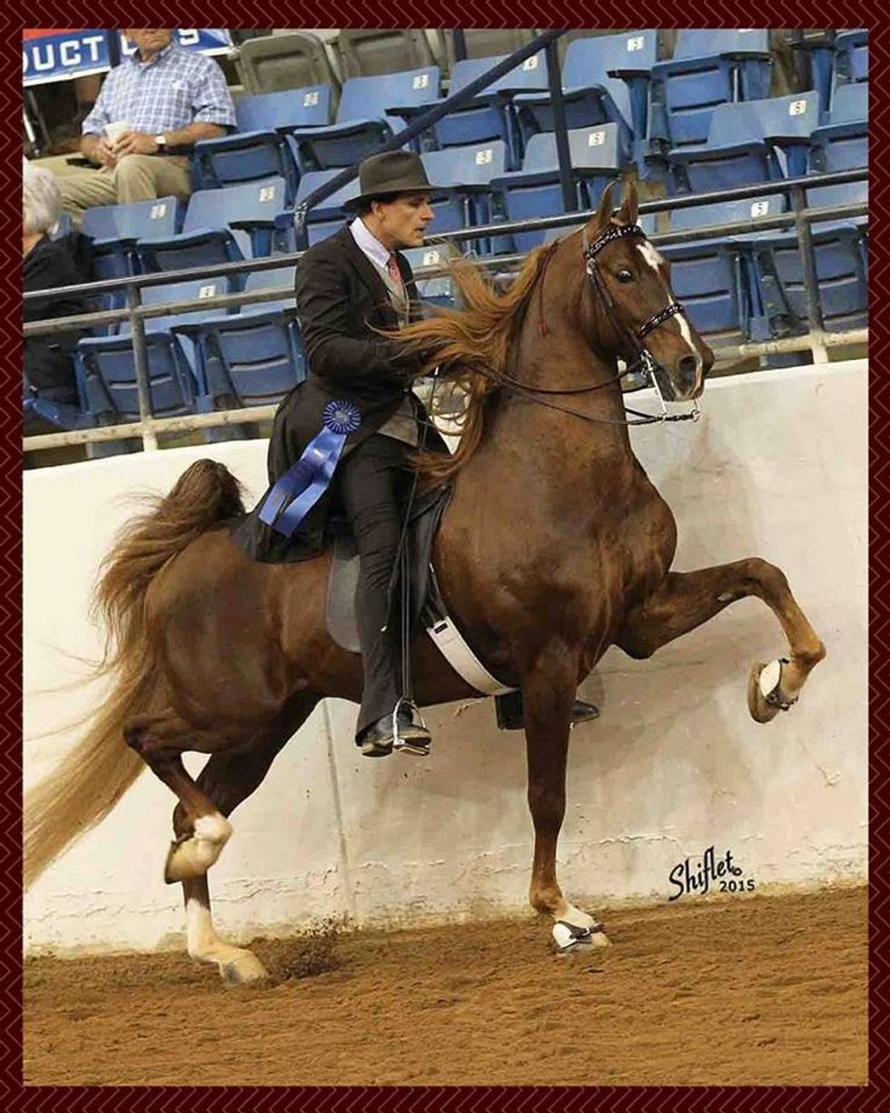 Yes, most Saddle Seat horses wear a pad on their shoes, however they are regulated as to how much they can weight and how long the overall foot can be. If a horse has on a shoe that is too heavy or if upon measuring the hoof, which all champion and reserve champion horses must have done immediately upon exiting the arena, they can be stripped of all awards won in classes in which these violations occurred. While many trainers will employ the use of action devices, chains are light and do not cause pain or pinch and bungees that are strapped between the two front legs rotate freely around the coffin bone and break if too much force is applied. These devices are used just like a human athlete uses weights and resistance bands, to build muscle. Finally, trainers of these horses will not want them to be sored, because a sore horse would not be able to perform the gaits asked of them properly and would be extremely unhappy. Those two violations of judging standards would result in the horse being penalized in placing rather than rewarded.