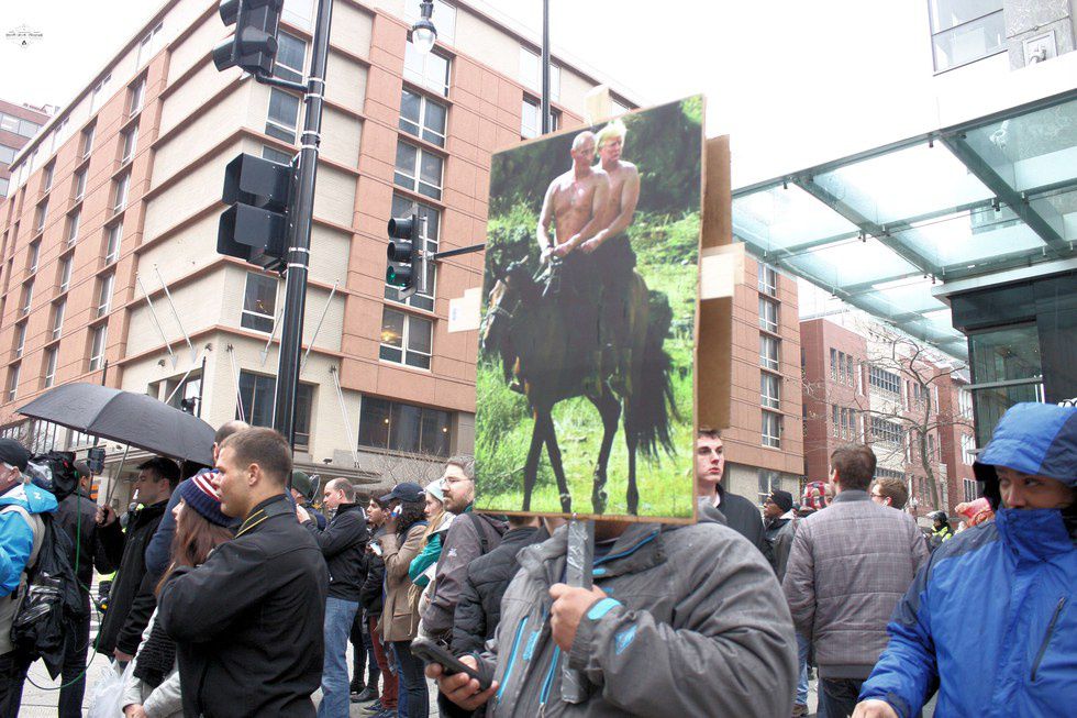 That wouldn't be the only time we would come across them. We went down the street and ended up falling back in front of them. Many of the protesters who had been there had come and gone. They continued to stand there as more photographers and reporters poured in. As I stood back and watched, I saw many of the same faces from the other protest. Even Vermin Supreme was there. He moved quickly through the area as people began noticing him, only to be turned around by the police.