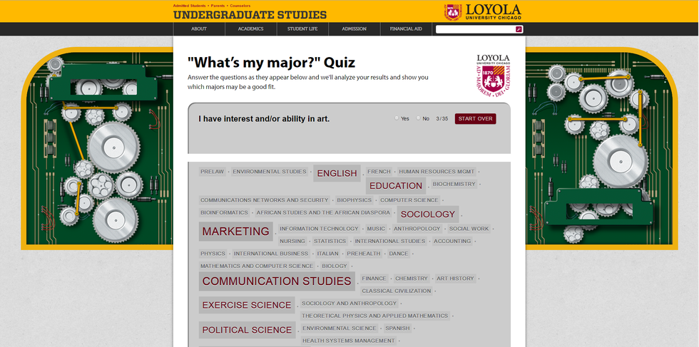 It's free! No need to pay a fee or sign up with an email to get your results! By asking a user personality-based questions, Loyola's Major Quiz enlarges the type of career fields you can most efficiently apply those skills. It doesn't just enlarge one career field either, it enlarges fields that could be alternatives. It's quite simple, and hey, we all like to take personality quizzes right?