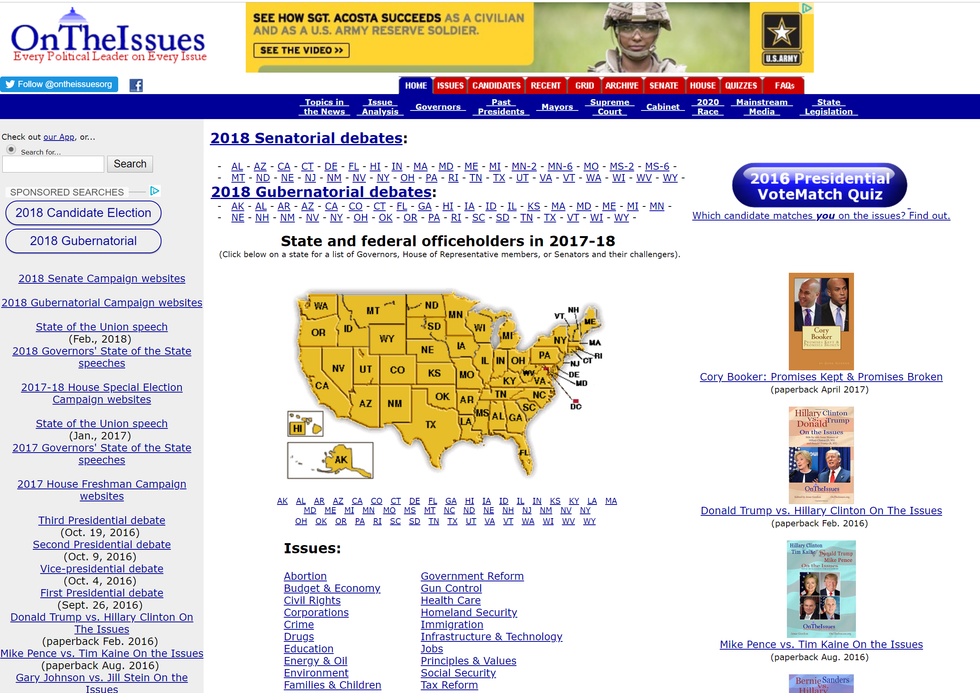 This website offers a look back at the politician in question's opinions and stances on certain issues throughout the 1990's up until the early 2010's. This can be very helpful if you want a background on who is running for important positions in the senate or house. It provides information on most issues but isn't the most up to date website out there, but it does have a lot of information on candidates who have been in politics for a long time.