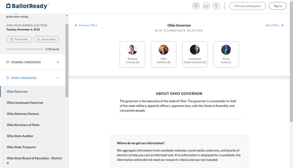 This website is super easy to navigate. All you have to do is type your address in, and it will create a fake ballot for you. If you make an account on this site you can save your choices you can print out your choices and bring them to the polls with you. It allows you to check out each candidate's opinion on certain issues and compare them to the others running for the same position.