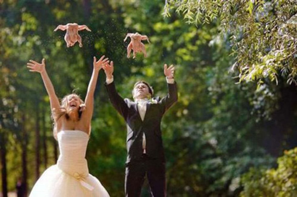 I say just stick the traditions. Today the most original thing you can do is to keep it simple. So stick to basics, maybe a rainbow bouquet or a "no heels rule" to spice things up. However once your pictures involve throwing up raw chickens, I think it's safe to say creativity has it limitations.