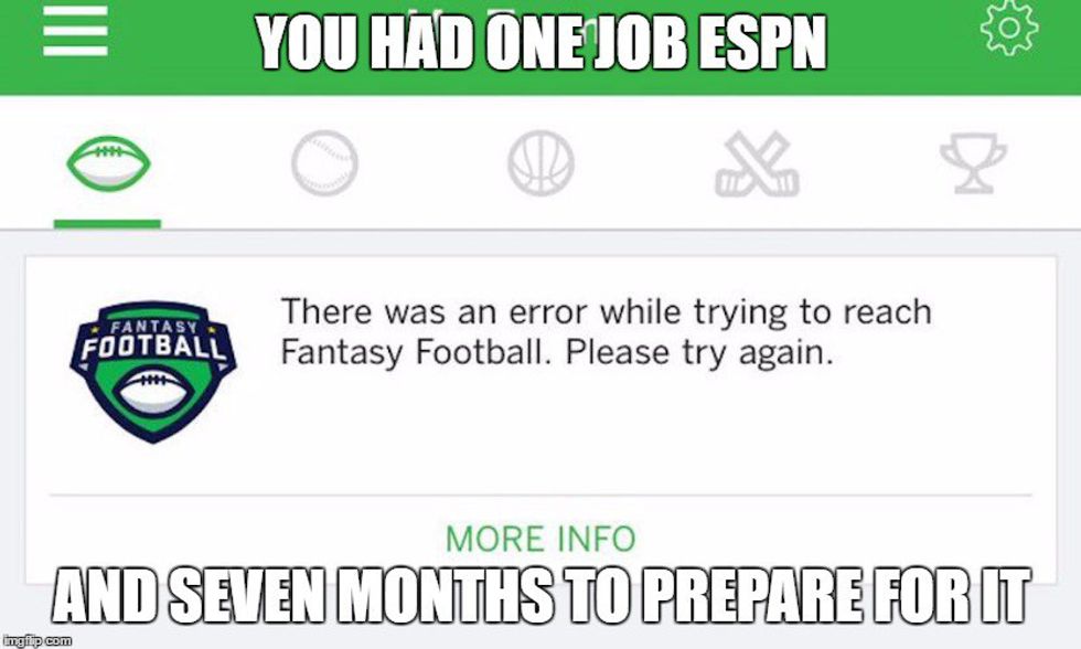 Many NFL fans like to partake in the wonderful hobby of Fantasy Football. ESPN is the leader in service providers, with millions of leagues and plenty of devoted fans. On the opening day of the NFL season, ESPN had one job: to make sure their App worked. With seven months to prepare for this day, their App crashed within 15 minutes of the first game kicking off. For four hours after, it would continue to crash. This caused massive anxiety to Fantasy Football users, as many people have a lot of money on the line and needed to change their lineups for the four o'clock games. I won't go on long about this because most people don't care, but this made me hate ESPN more than I already did. It's a good thing my teams played well, or I may have written this entire thing about them.