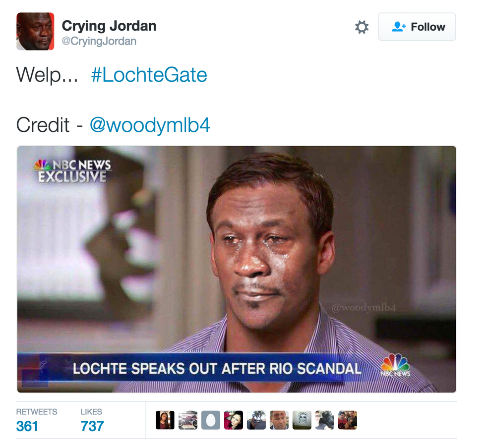 Twitter, of course, was less lax upon hearing the truth, and thus, the #LochteGate hashtag was born, spurring countless memes and even harsh reprimand from Today Show host Al Roker. You can see this video, and some of my favorite #LochteGate tweets below: