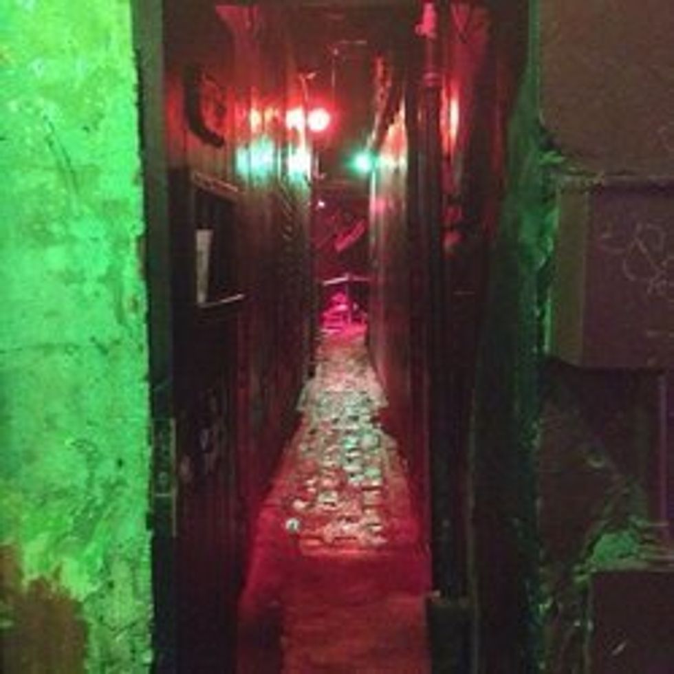 The walls are black. The floors are dirty, but you can't tell because they're black too. The stools are old. And black and rickety and gross. The only light comes from the red lamps behind the bar shining through the liquor bottles and a big orange pitcher of punch that reads "The Key to the Chastity Belt," which frankly, is a bit rapey, but so is everything about this place. One must also notice the bartender puking on the floor in the corner between making drinks. I'd say not to go there if it wasn't the perfect place to sit alone drinking cheap beer, sh*tty cocktails and smoking endless cigarettes. But it's not the place for seven guys to spend an evening, so we moved on.