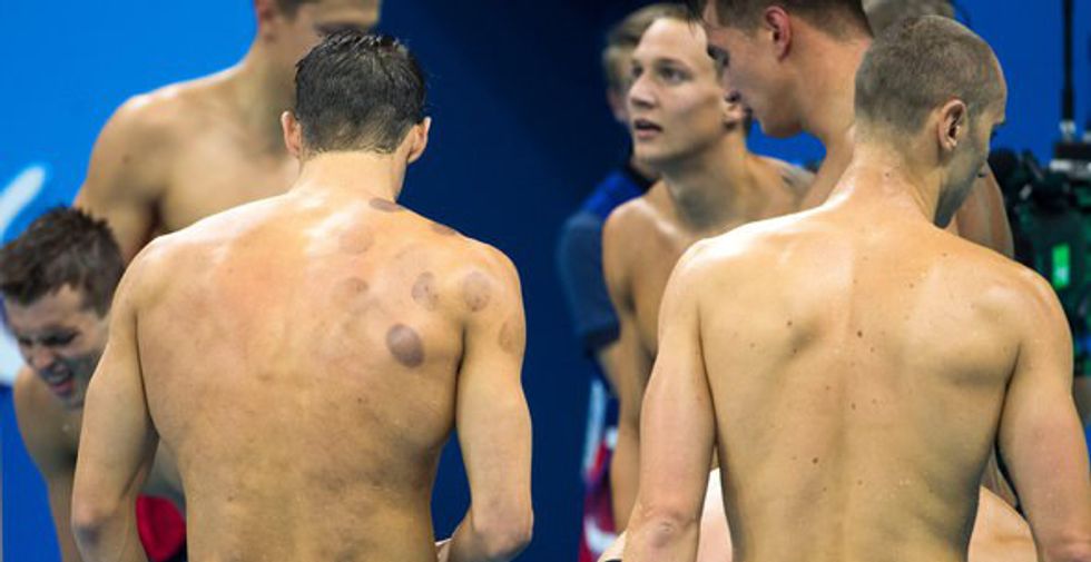 Fire cupping involves taking a series of glass globes or jars, and removing the oxygen from the inside, then placing them on the muscles. The oxygen can be removed from the inside of the jars ether by placing a small torch inside for a brief second to burn it (where the name comes from) or through the modern method of sucking the oxygen out via an attached machine. The cups are then placed over the skin; because the oxygen has been removed, the skin will try to fill the void, causing a sucking sensation. Through proponents claim that the technique doesn't hurt, the suction motion is enough to break the capillaries beneath the skin and cause a bit of blood loss, causing the signature bruises. If this process seems a little bit deja vu, it's the same science behind why hickeys leave bruising. Proponents of cupping therapy claim that the procedure removes toxins from the blood, draw blood to an afflicted area, improve sore muscles and improve athletic performance. Phelps even posted a photo of himself on Instagram, thanking his therapy for his pre-competition cupping session.