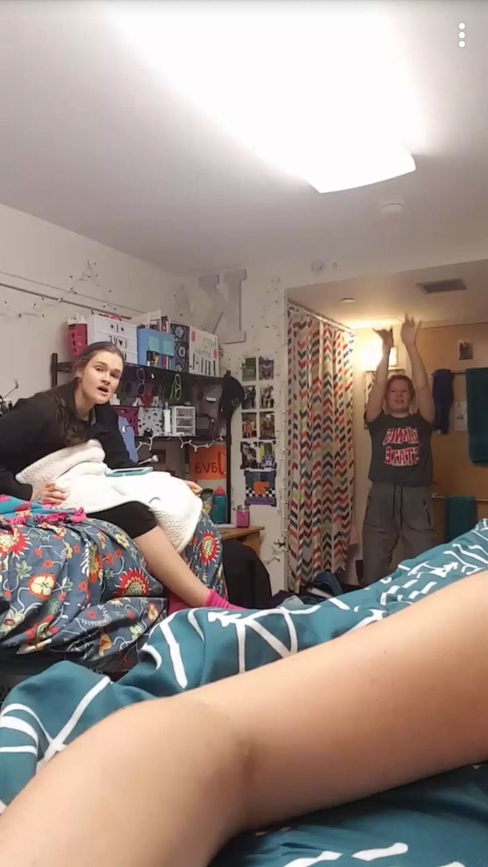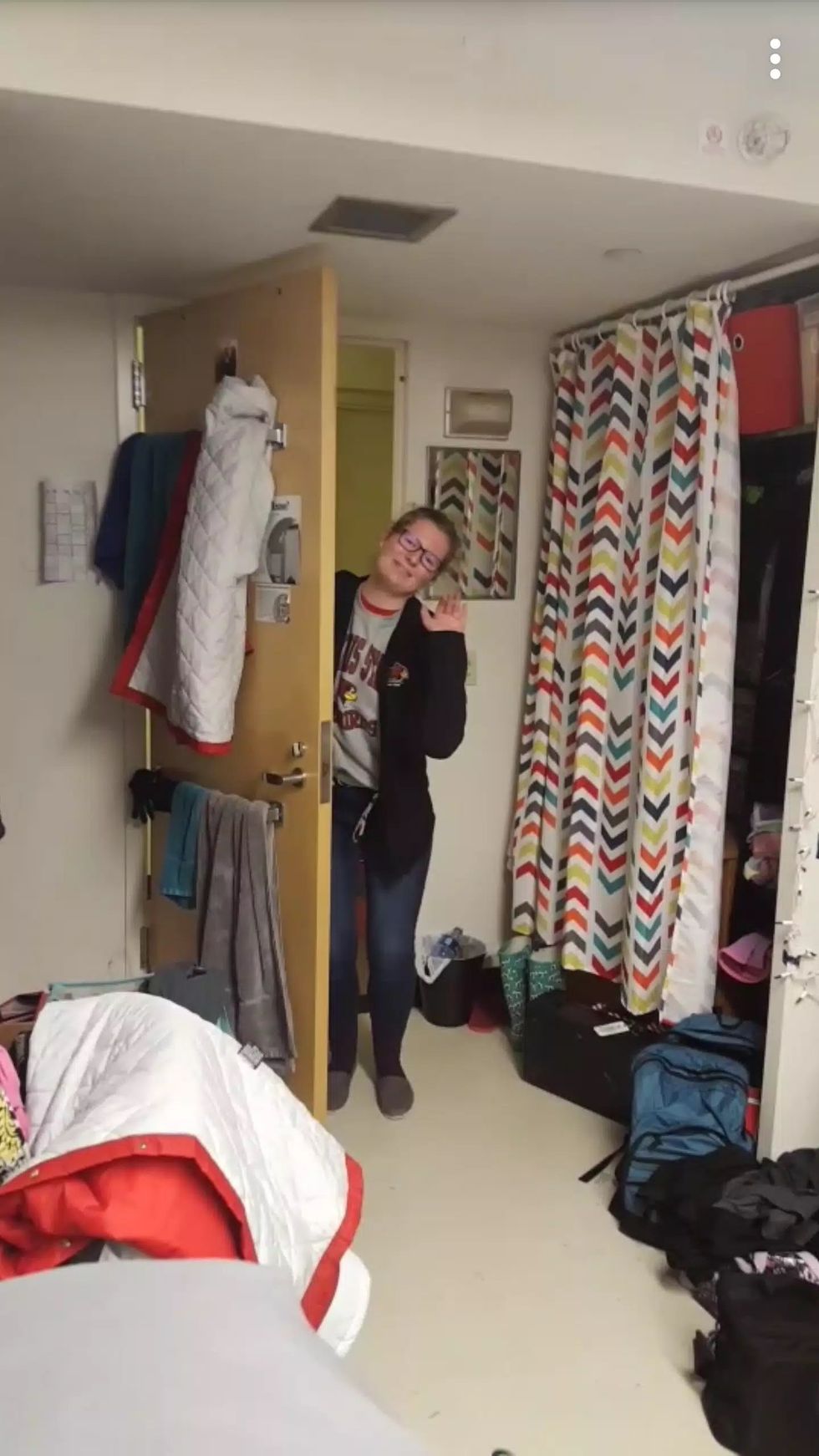 Like literally hitting her with it because she's standing in her closet which is right next to the door because these rooms are tiny.