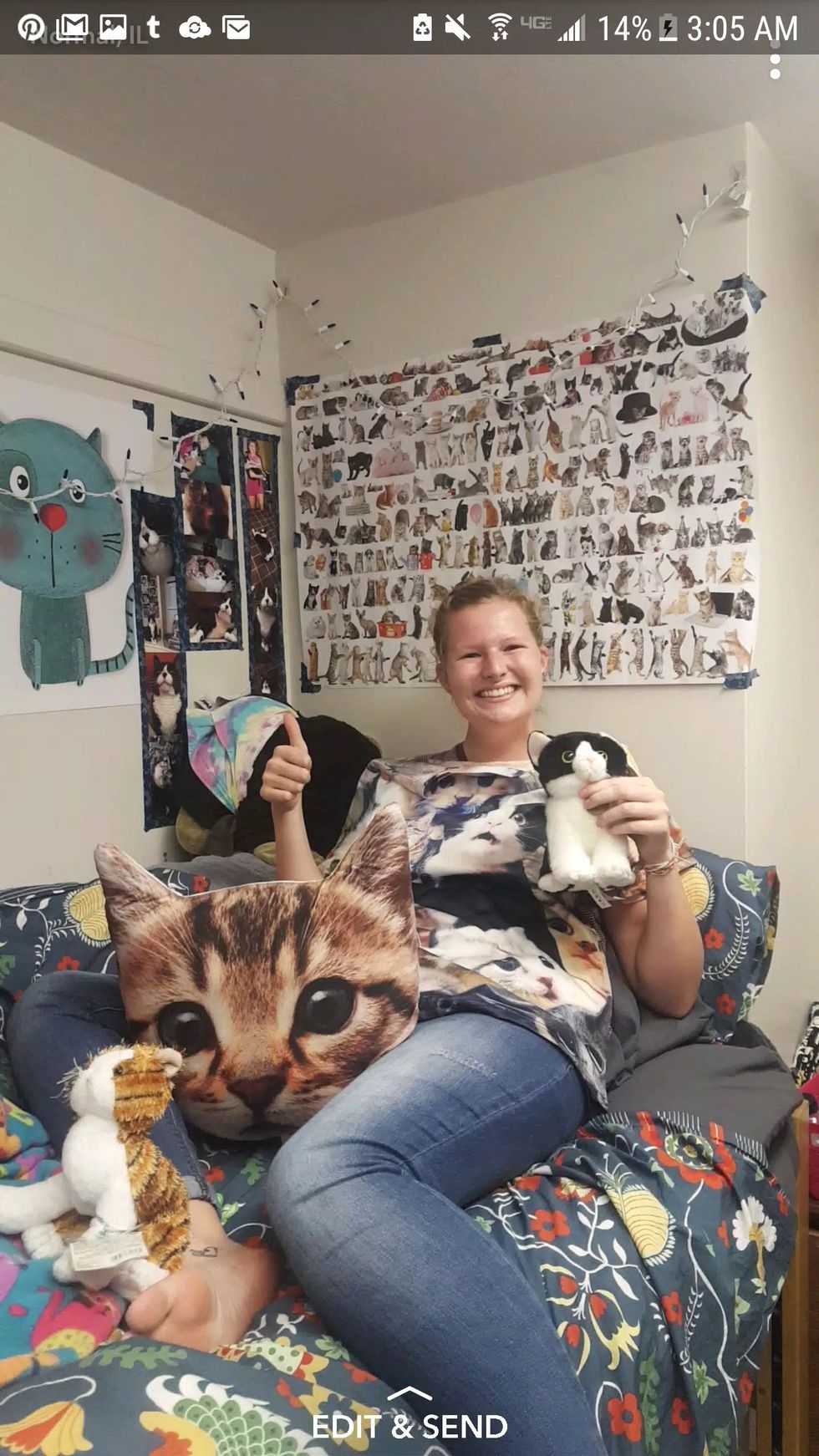 Roomie is in love with cats and yes, I do mean the crazy cat lady kind of love. Her entire half of the room is covered in cats and she's especially fond of her kitty back home, Otis.