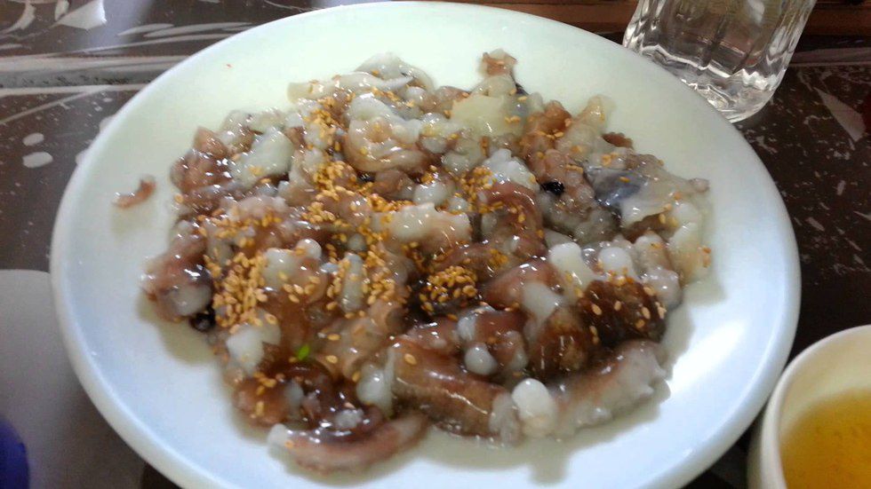 The native Korean dish is live octopus cut up, and seared with sesame oil. Be careful while eating because the tentacles an still stick to your throat!