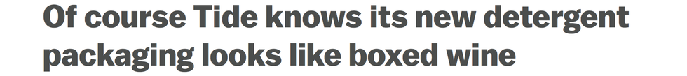 Tide, the same company who's products were part of January's infamous Tide Pod Challenge, now has new 'eco friendly' packaging that looks suspiciously like a knockoff of Franzia.