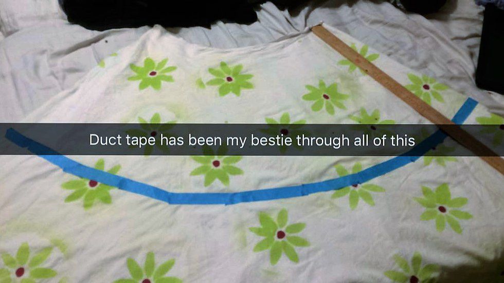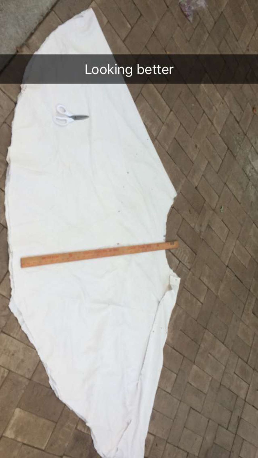 Seeing how it still hadn't reached a skirt like look to it, I decided to even it out and make it look a little bit shorter. I'm terrible at cutting straight so I just placed a curved duct tape line along the skirt for me to follow which actually worked.