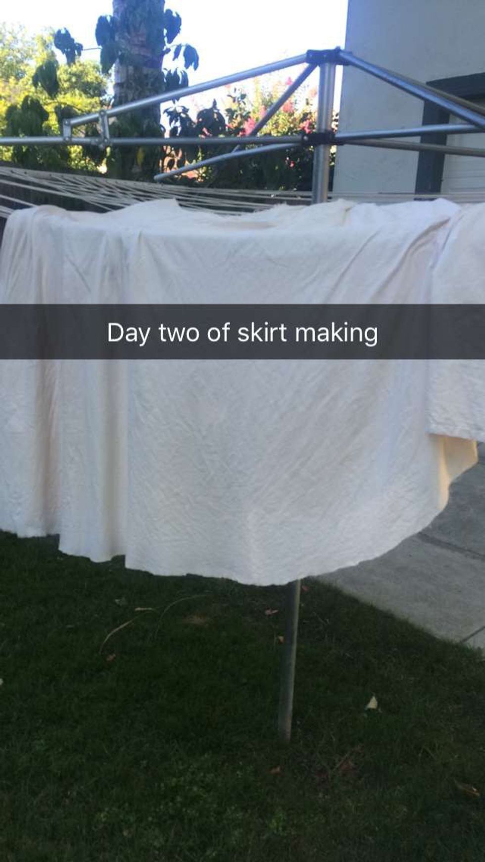 As you can see it has a very unique design of a white circle skirt with green and red flowers on it. First, I know for a fact that you can buy this whole outfit online and yes it is absolutely gorgeous but I decided to take it the hard/fun way. Now, seeing how YouTube is YouTube, there were about 100 or so videos on how exactly to make your own circle skirt. I did watch them, but after losing focus a couple minutes into it, I decided, meh what do they know it's not like they are actually trained professionals I got the gist of this. So with that, I went straight to work on the nearest white bed sheet I owned and made a circle in the middle of it, because that's how a majority of the tutorial videos started. I had hopes that what I made was a tiny circle at best and if it was too small I could go bigger.