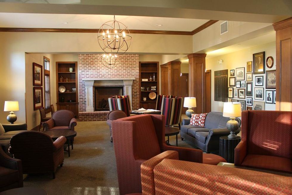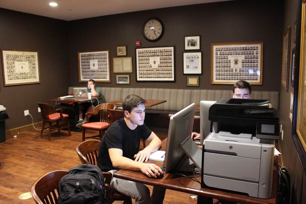 Immediately to the left is the formal lounge, featuring a large fireplace and modern furniture. Phi Psi’s history can be tracked through composites and vintage photos arranged on the walls, and elaborate light fixtures add to the traditional feel of the room.
