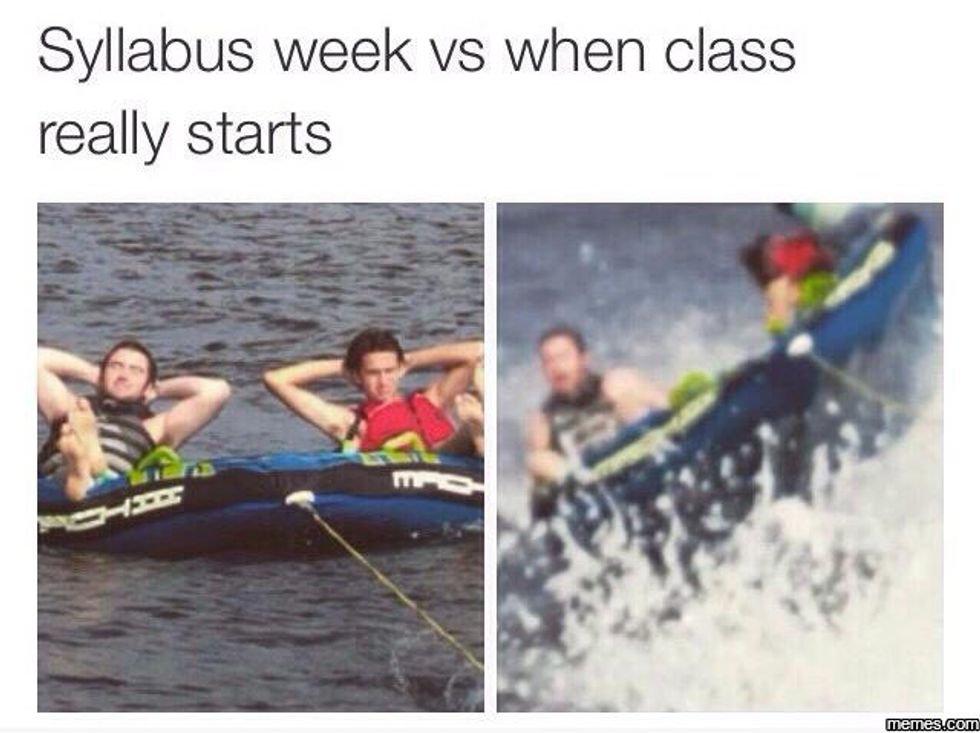 Welcome to syllabus week; the first week of classes in which every professor will be passing out the key to your success in the class. In high school this would have been a useless item that you probably had to take home to get signed and then misplaced it in the bottom of your locker. This isn't high school though, you won't be babied and told when a paper is due or when you have quizzes. However, many professors will go over their syllabus in class one time to make sure everyone is on the same page. This obviously means very little instruction goes on during the first few class times. Syllabus week is also synonymous with the infamous welcome week. Students moving back to campus + very little class instruction = parties. All the time. So, in order to help you survive syllabus week, here are a few tips: