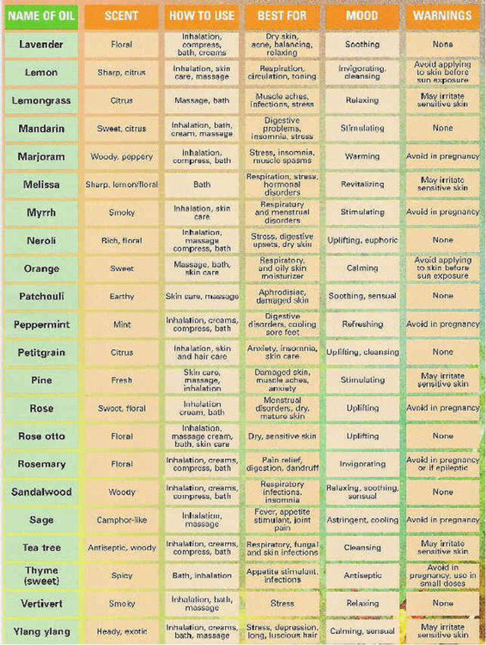 Below I have attached a basic chart for beginner users. Experiment and pay close attention to how your body reacts to the new adventure of aromatherapy!