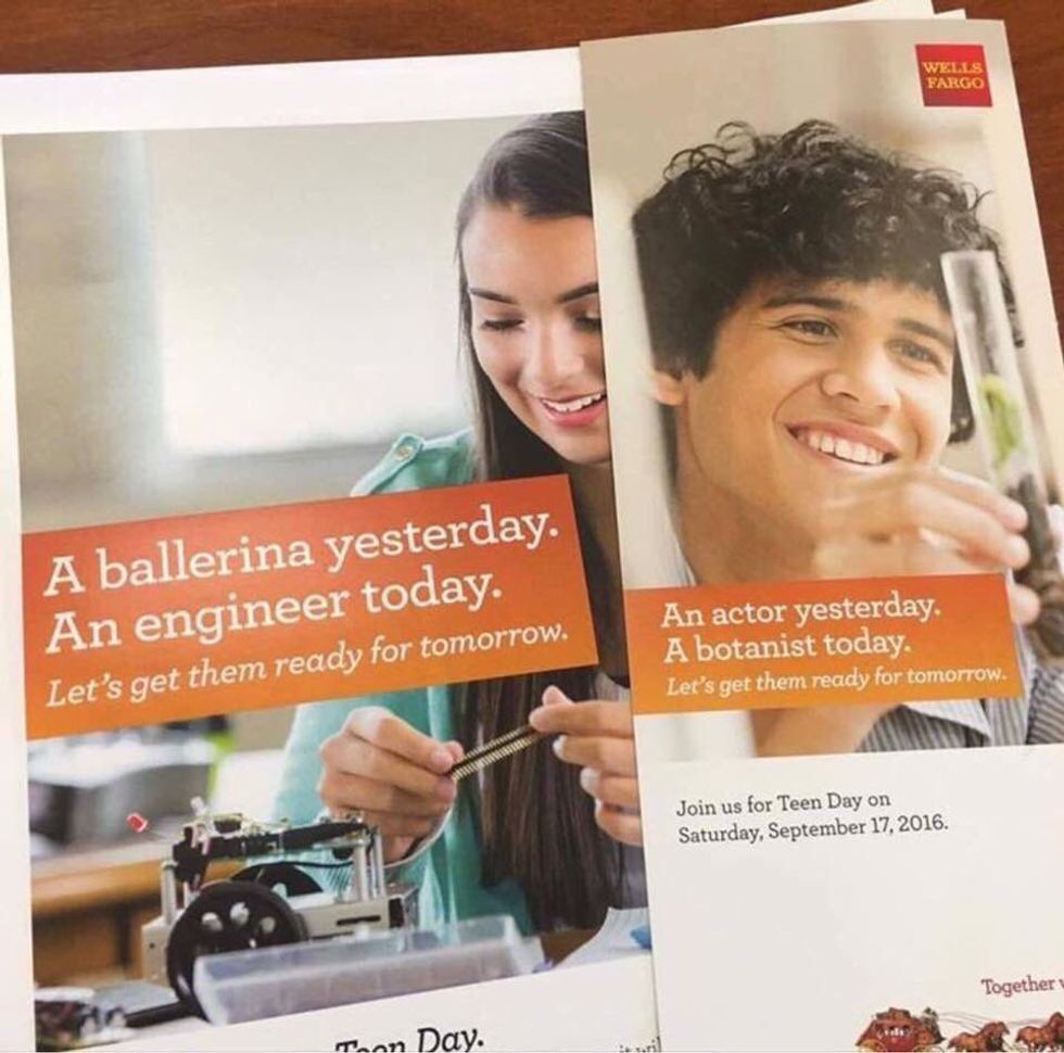 Wells Fargo recently released an ad for a “Teen Day,” displaying two students doing science experiments and including the text, “A ballerina yesterday. An engineer today,” and “An actor yesterday. A botanist today.” Both are followed by the statement, “Let’s get them ready for tomorrow.”