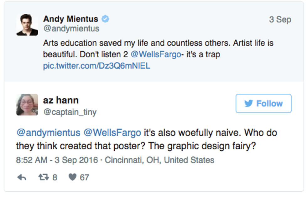 This Wells Fargo ad is not the first example of people’s disdain towards the arts. The Washington Post released an article discussing the issue of parents forcing their children to ignore the liberal arts in favor of more lucrative STEM or business majors. In the article, Steven Pearlstien describes reports of liberal arts majors living lives of deprivation and disappointment as overly exaggerated. He explains that it is true that STEM and business majors earn the most, but even the average humanities major earns enough to fit comfortably in the American middle class. It would be a mistake to attribute success solely to the choice of major.