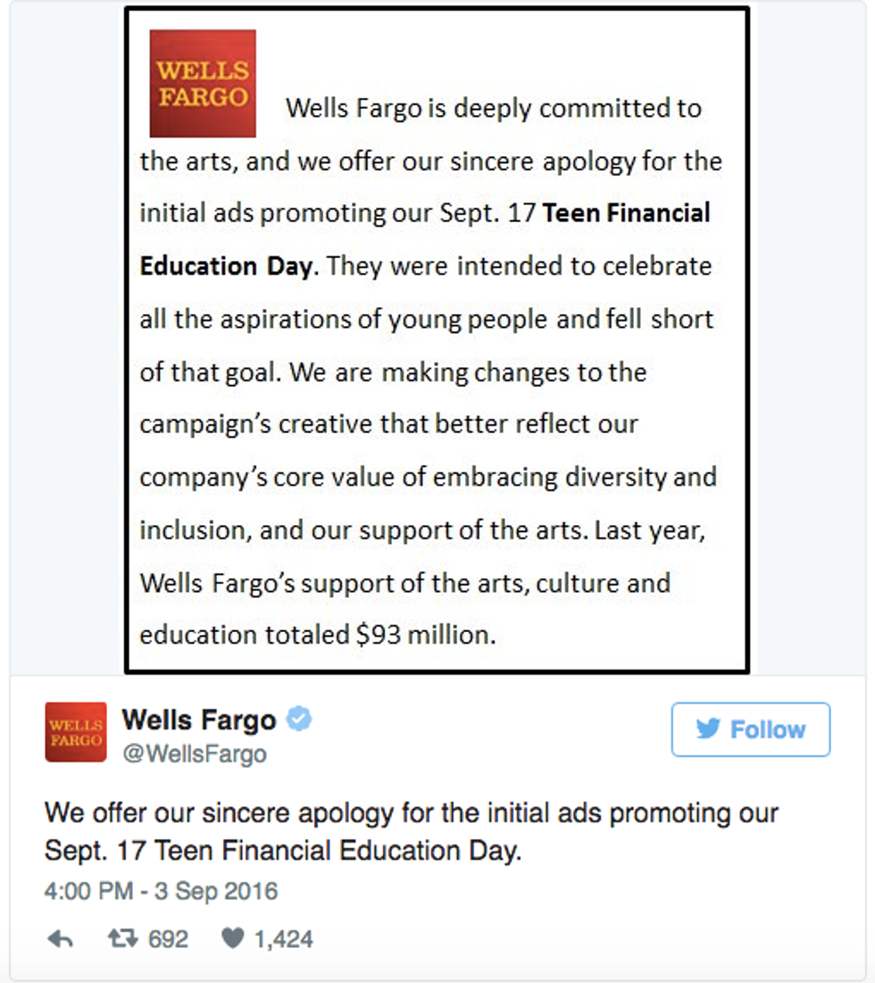 Wells Fargo has recently released a statement apologizing for their advertisement: