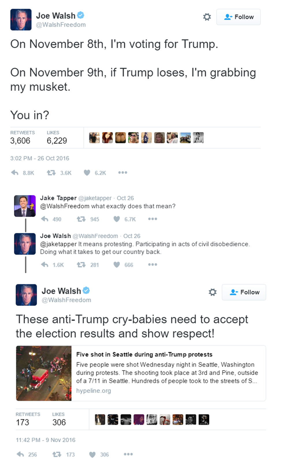 I took a look at the quote-unquote "s---" to which she referred and found, for the most part, fairly peaceful protests which took place over the course of the week following the election. Again, mostly peaceful. There were violent protests, some of which reached riot status. Police became involved. Arrests were made. And Republicans, quick to forget their own transgressions against Obama's election and subsequent re-election, hypocritically condemned these protesters.
