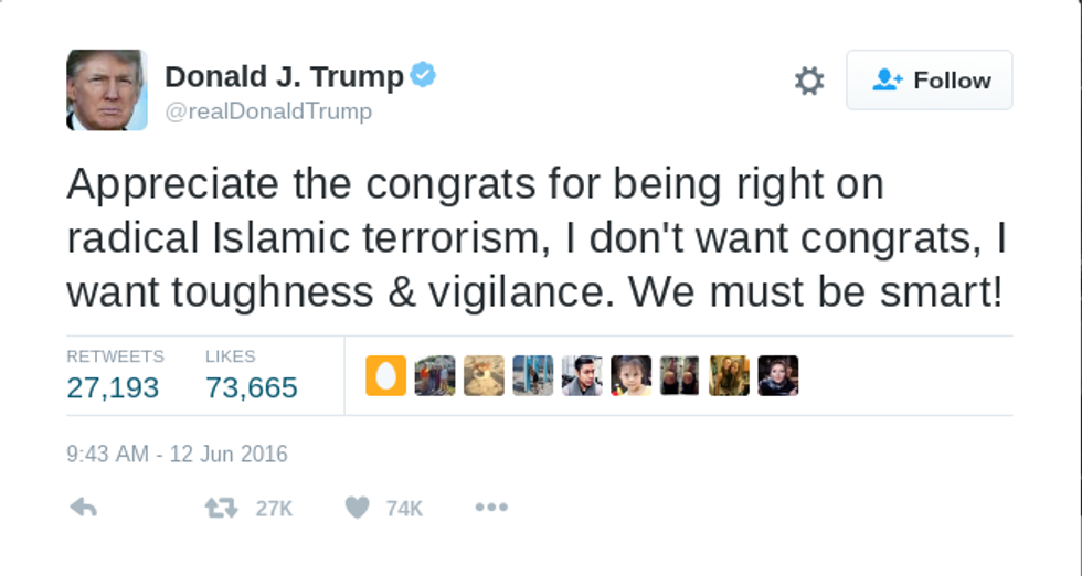From what we saw from the Pulse Nightclub shooting, Trump did respond once by sending prayers to the families of the victims, but, the fact is that Trump is incapable of showing real sympathy for the 49 deaths and 53 injured peoples involved. Instead, hardly an hour later, Trump was well prepared to use the situation to prove that he was "right" in regards to terrorism.