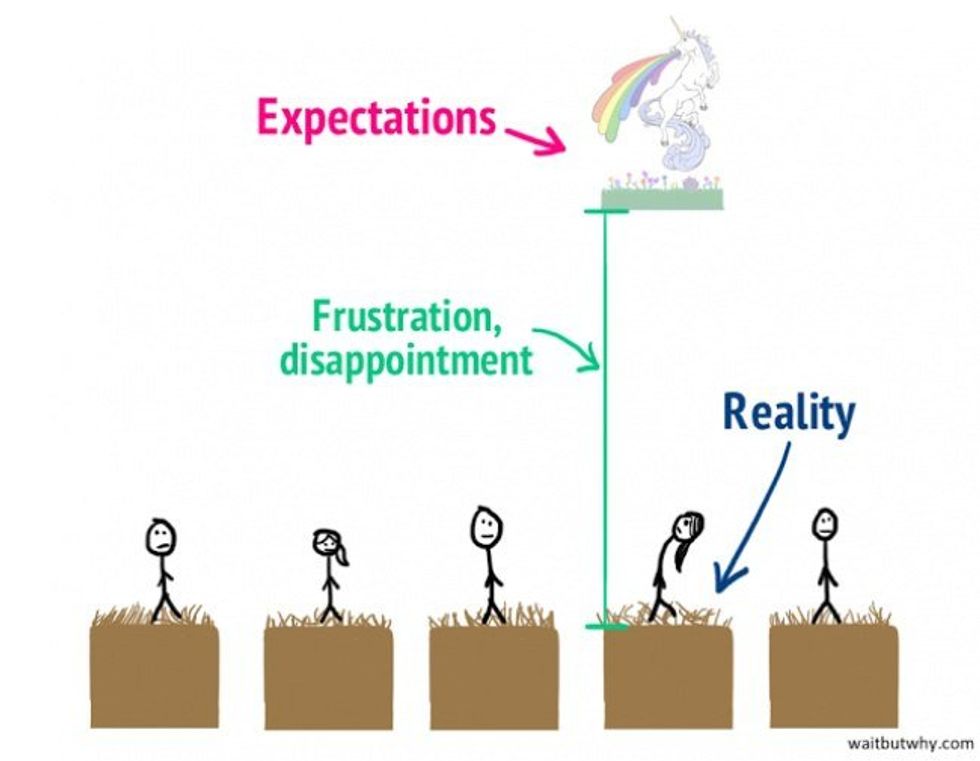 We are unhappy because our expectations are better and bigger than our reality. We expect that we will get that six-figure, meaningful, high-profile job right after college. We expect that we will have free time, go on fabulous Instagram-worthy adventures, party hard most nights, and still make great grades… And we are unhappy because those “expectations” are what we see plastered over the walls of our Facebook page and the feeds of our Twitter accounts, without realizing that those aren’t accurate measures of most peoples’ realities anyway.