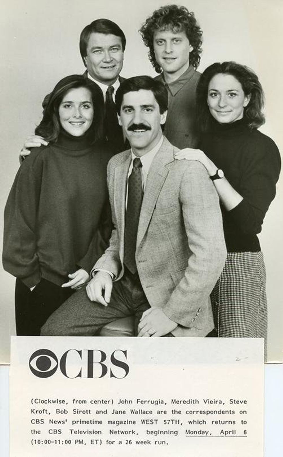 "West 57th" was hosted by Meredith Vieira and John Ferrugia from 1985 to 1989. Bob Sirott and Jane Wallace hosted the show from 1985 to 1988. The correspondents for the show were Karen Burnes, 1988 to 1989, Stephen Schiff,1988 to 1989, Selina Scott, 1988 to 1989, and Steve Kroft from 1987-1989.
