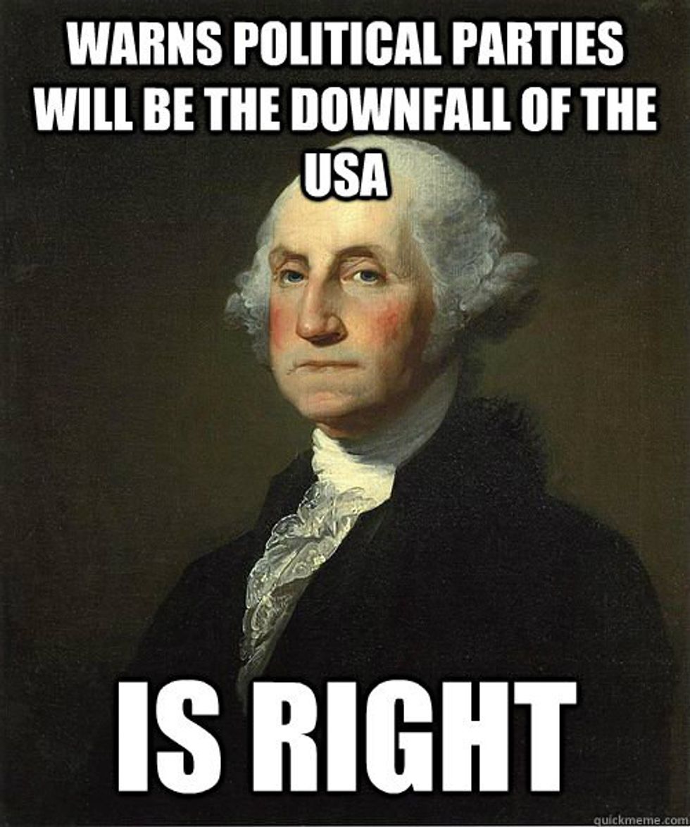 1. George Washington, our first president, warned us of the dangers of political parties. He claimed it would divide the nation and cause more animosity.