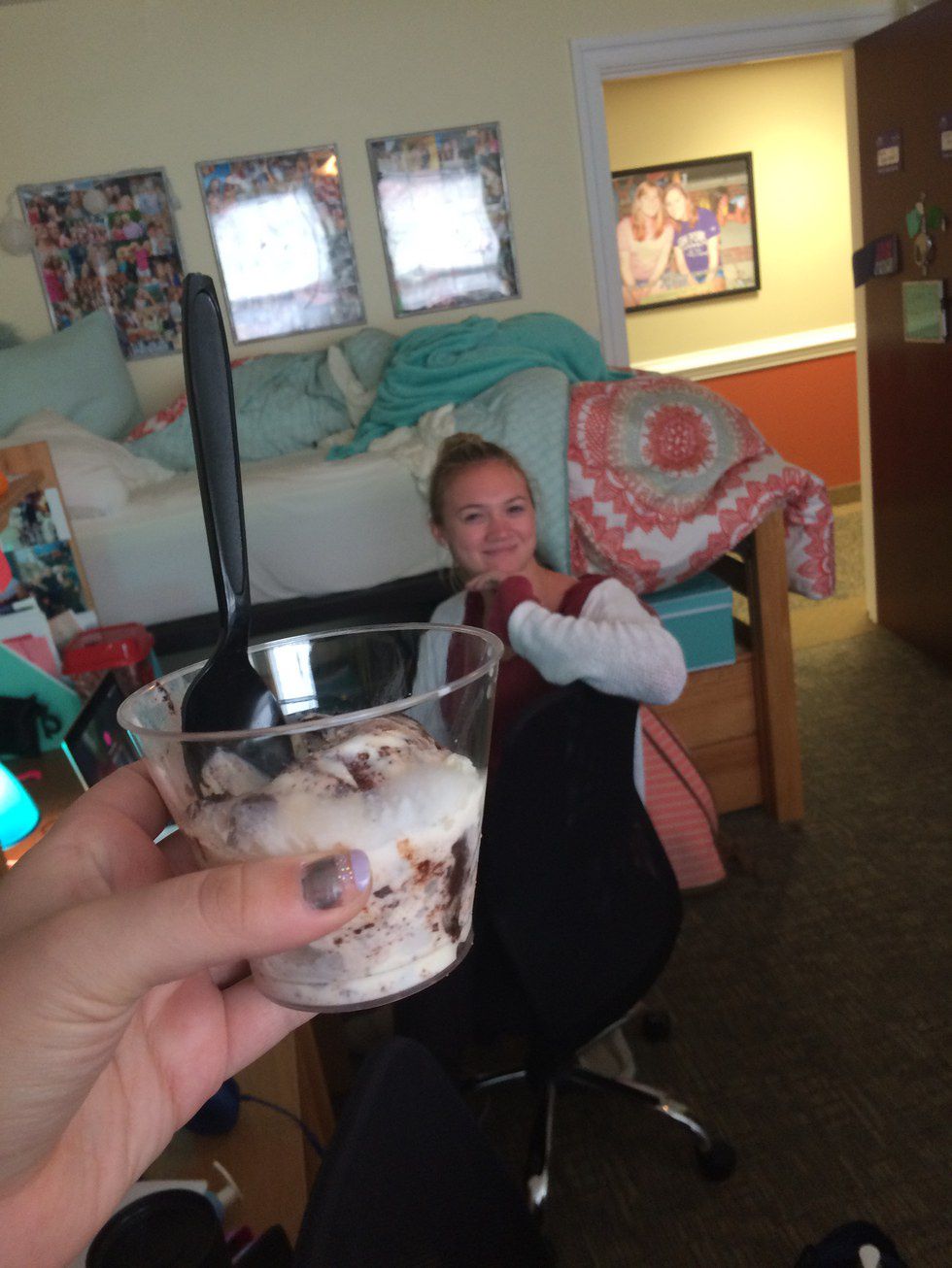 For some odd reason, we both wake up every morning with sore throats. The only real option is ice cream. Plus, it's something to look forward after a 7:50 a.m. class. Judge us, we ain't caring.