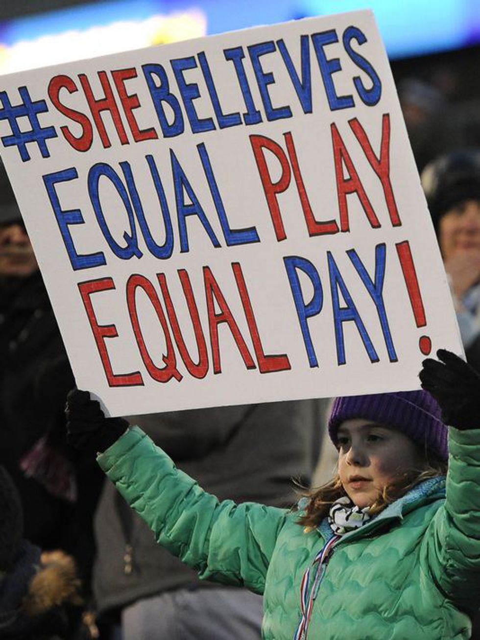 We march for the equal pay of women. I keep hearing that women do get paid the same, because that's the law, but employers find ways to avoid this. We march because employers find ways to pay women less than men for the exact same job.