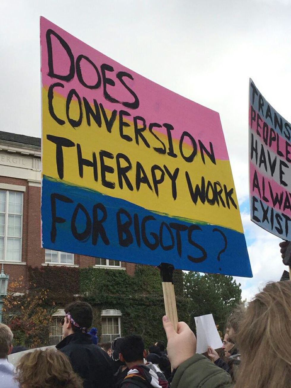 So sure maybe women have the rights that men have, but they are not treated like equals. Maybe women can vote, but their opinions are not as important as the opinions of men. Maybe right now women have access to Planned Parenthood, but this administration is already working to take that away. Maybe gays can be married now, but this administration is working to take that right away, and our Vice-President believes that we can shock gays until they are no longer attracted to the same sex. Maybe Muslims are allowed in America right now, but our president's plans to remove them and his rhetoric toward Muslim Americans is damaging and dividing us even further. We march for everyone that Trump does not respect: women, people of color, Muslims, gays, trans people, disabled people. Yes, these injustices were there in America before January 20th, sure, but at least we had a president that fought for us. We had a president that didn't add to the harmful rhetoric. We had a president that we counted on, but now our rights are under fire and our nation's leader is also the face of male chauvinists, homophobes, racists, xenophobes, and bigots.
