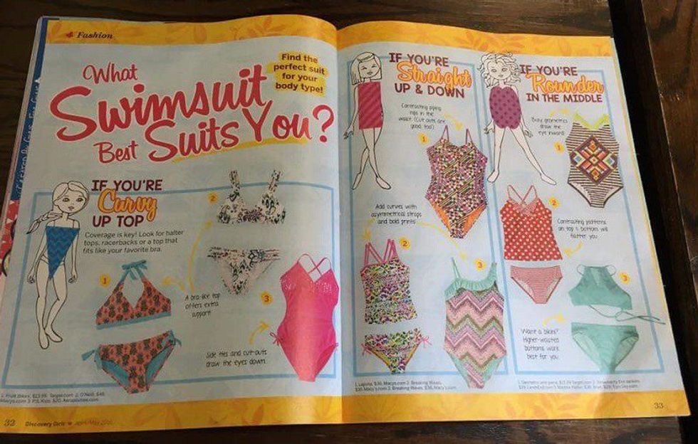 I recently came across an issue I could not stop thinking about--for this reason I decided to publicly express my feelings on it. I came across a page for swimsuits in a "tween" magazine called "Discovery Girls." When flipping to the page, you are greeted with large, bubbly pink letters at the top which reads "What swimsuit best suits you" showing pictures of different styles of bathing suits with descriptions of which body type works best with that specific style for young girls. The three "body types" which were mentioned were written as "If you're curvy on top," or "If you're straight up and down," and "If you're rounder in the middle."