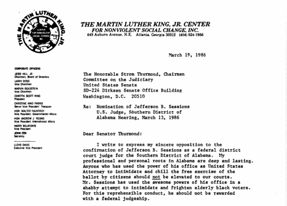 So, now that Jeff Sessions is the attorney general, I figured that reading the letter by Coretta Scott that is now credited with stopping Sessions in the '80s would give us some insight into what to expect from this attorney general.