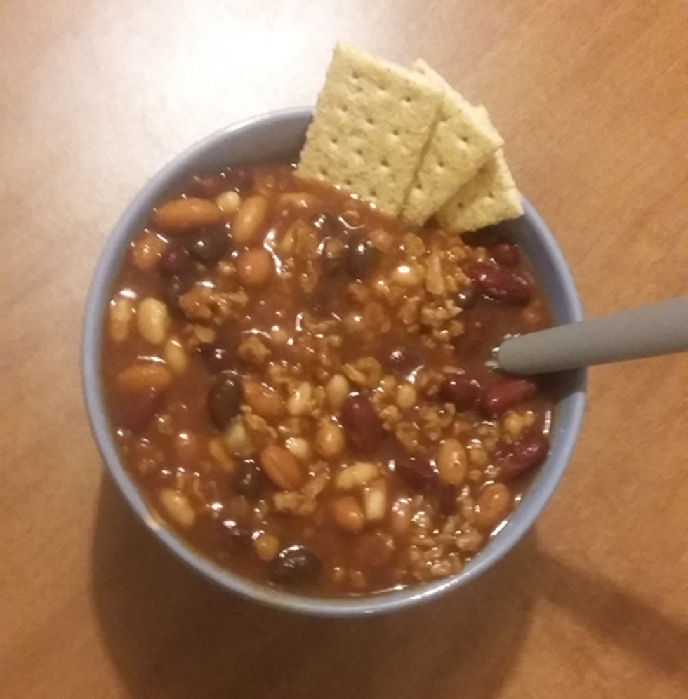 This is one of the cheaper meals that I make regularly. Aside from basic spices, all you need for this recipe is a few canned items. Oh, and the secret weapons! The two things that really make this chili wonderful are Figaro Liquid Smoke, which adds a ton of flavor.