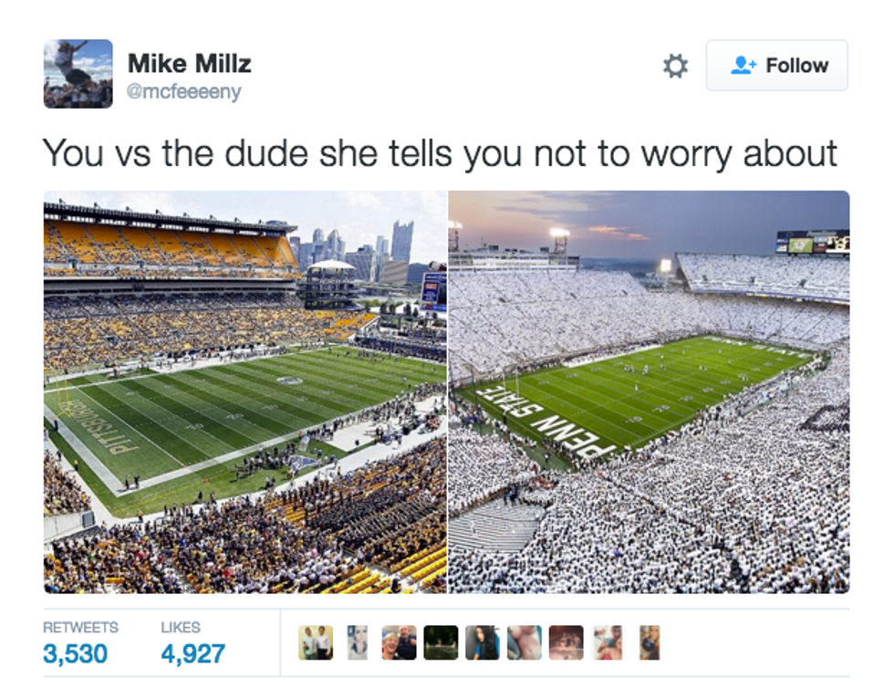 If you go throughout #PittHateWeek, there are plenty of funny joke among other thing us, Penn Staters did. But when you go to #PennStateHateWeek the only thing they had on us was Jerry Sandusky — and is that's something to make fun of? Like, I'm I the only one that doesn't find that funny? Because those of you Pittsburg people that think that's a funny joke, your kind messed up in the head. But beside that what else can Pitt say about us?
