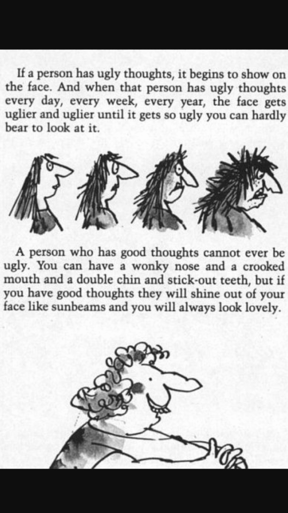 A person who has good thoughts cannot ever be ugly. You can have a wonky nose and a crooked mouth and a double chin and stick-out teeth, but if you have good thoughts it will shine out of your face like sunbeams and you will always look lovely.”