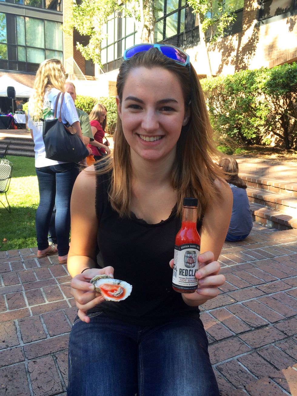 In case y'all can't tell, I'm a sucker for oysters. Fried, steamed, baked, I'll eat them, so this event was the highlight of my week, especially since I got to try a new local concoction at the same time. Right before I walked over to the roast with my roommate, I dragged her into Caviar and Banana's to pick up a bottle of Red Clay Hot Sauce to bring with us.